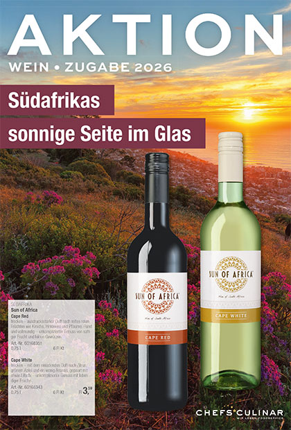 CHEFS CULINAR bietet alles an, was die Herzen Wein- und Spirituosenliebhaber höher schlagen lässt. Unter anderem 550 Katalog-Weine plus 1.000 weitere Weine von unseren Partnern. Dazu gibt es köstliche Aktionsweine zur Saison, wie Spargel- oder Wildweine sowie Federweißer.