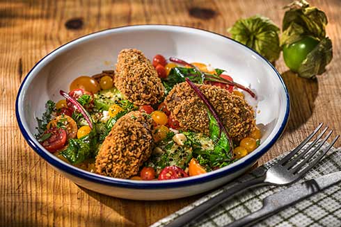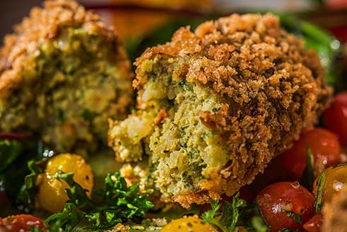 Basmatireis kochen und auskühlen lassen. Petersilie, Koriander, Knoblauch, Shiitake, Salz, Pfeffer, Chili und Kichererbsen samt der Aqua Faba in einem Kutter zur einer kräftigen Marinade mixen. Den geräucherten Tofu dazu geben und nochmals mixen. Haferflocken, Karottenraspeln, Poreestreifen und die Marinade mit dem ausgekühlten Basmatireis gut vermengen und zu Tischtennisball-großen Nocken oder Kugeln formen. Kichererbsenmehl mit Haferdrink glattrühren und die Reiskugeln darin wenden. Anschließend in Pankomehl welzen und in der Friteuse gold gelb ausbacken.