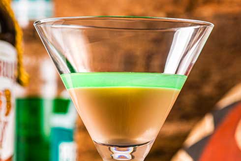 Schnapsgläser mit Amarula Cream zu etwa 3/4 füllen, Pfefferminzlikör vorsichtig an der Glaßinnenwand bis zum Rand auffüllen, so dass sich die beiden Liköre nicht vermischen.