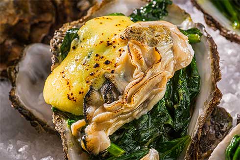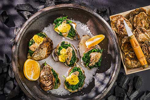 Butter in einem Topf aufschäumen, gut gewaschenen und abgetropften Spinat hineingeben und zusammenfallen lassen. Spinat mit Pfeffer und Meersalzflocken abschmecken und auf einem Sieb abtropfen lassen. Dabei den Spinatsud auffangen. Schalotten fein würfeln, mit dem Spinatsud einkochen und mit Schlagsahne, Knoblauch, Wildkräutern und geriebenem Cheddar verfeinern. Frische Austern öffnen und von Schalensplittern mit Hilfe eines Pinsels befreien. Die Austern aus der Schale herausnehmen. Die Unterseite der Austernschale mit dem Spinat befüllen, jeweils eine Auster darauf legen, mit der Sahne-Cheddar-Sauce nappieren und wieder mit dem Schalendeckel verschließen. Auf einem Grill oder in leichter Glut die Austern ca. 8-12 Minuten garen. Die Austern aus der Glut herausnehmen und warm in einer Schale servieren. Zitronen vierteln und bereitstellen.