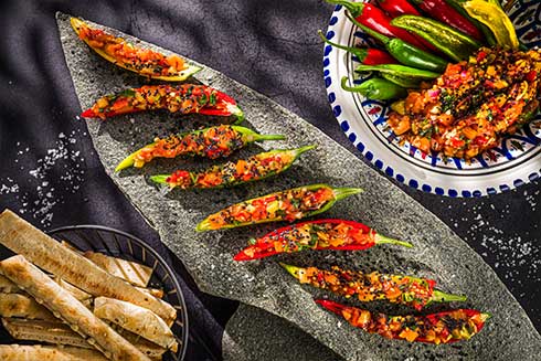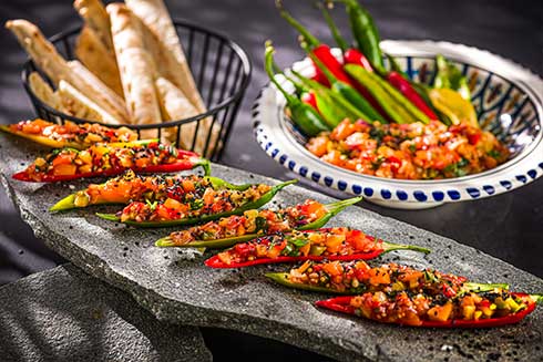 Schalotten, Tomaten und Paprika in feine Würfel schneiden und mit Limettensaft, Olivenöl und Salz abschmecken. Sesamsaat rösten und untermengen. Grüne Chilischoten auf einer Seite einschneiden und gut von Körnern und den Häutchen befreien, ggf. ausspülen. Die vorbereiteten Chillischoten mit der Schalotten-Tomaten-Mischung füllen.
