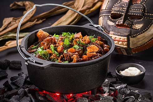Ochsenschwanz in Stücke schneiden. Schweinebauch in kleine Stücke zurechtschneiden. Zimt, Kardamon, Bockhornklee, Koriander, Kreuzkümmel, Lorbeerblätter, Meersalz und Senfkörner in einem Kutter pulverisieren. Die Gewürzmischung mit Weizenmehl vermengen und die Ochsenschwanz- und die Schweinebauchstücke darin wenden. Gußeisernen Topf mit etwas Sonnenblumenöl benetzen und stark erhitzen. Butter darin schmelzen lassen, die bemehlten Ochsenschwanzstücke darin rundrum anbraten und wieder herausnehmen. Die Schweinebauchstücke in den Topf geben und anbraten. Mirepoix dazugeben und ebenfalls anrösten. Das Mirepoix mit Tomatenmark tomatisieren, mit Portwein ablöschen und mit Wasser angießen. Nun die Ochsenschwanzstücke beifügen und ca. 2,5 Stunden bei kleiner Hitze zugedeckt garen. Wenn die Ochsenschwanzstücke noch etwa 1,5 Stunden benötigen, dann die Schweinebauchstücke hinzufügen und garkochen. Den Frischkäse bereitstellen. Blattpetersilie und Minze waschen und grob hacken.