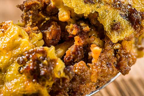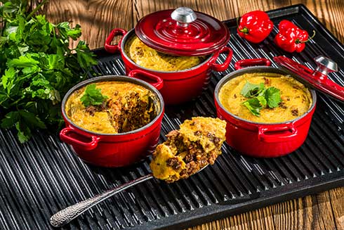 Rindfleisch und Lammfleisch grob wolfen. Weißbrot in der Milch einweichen und wieder leicht ausdrücken. Das Hackfleisch mit dem eingeweichtem Weißbrot, fein gehackten Zwiebeln, Knoblauch, Rosinen, Mandelsplitter, Currypulver, Kardamon und Thymian vermengen. Die Masse in Olivenöl bei mittlerer Hitze anbraten. Zur der Masse Aprikosenmarmelade, Chilipulver, Salz, Pfeffer und Zitronensaft dazugeben. In einer Backform die Masse verteilen und nach Belieben mit Lorbeerblättern garnieren. Eier mit Sahne verquirlen und über der Hackmasse verteilen. Den Hackauflauf ca. 30-40 Minuten bei 170°C backen bis sich eine schöne Bräune gebildet hat.