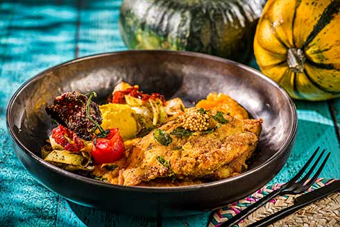 Kürbis waschen halbieren und entkernen. Kürbishälften mit Olivenöl und Salz einreiben und im Ofen bei 140°C weich garen. Kürbis mit Gewürzbutter und Aprikosenkonfitüre vermengen und fein stampfen.