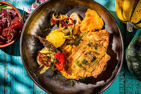 Fenchel waschen, putzen und in breite Streifen schneiden. Den Fenchel in Olivenöl anschwitzen. Knoblauch und gedörrte Tomatenstreifen dazugeben und mit einem Weißwein und Gemüsefond ablöschen. Den Fenchel knackig darin garen. Pap-Maisbrei laut Grundrezept kochen und bereitstellen.