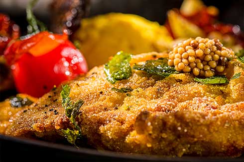 Senfkörner in Apfelsaft körnig kochen und abseihen. Krokodilschwanzstück mit Zitronensaft und Barbere-Gewürz ca. 2 Stunden marinieren. Die Krokodilschwanzstücke anschließend in Maismehl wenden und gut andrücken. Gewürzbutter erhitzen und darin die Krokodilschwanzstücke von beiden Seiten gut durchbraten. Auf Krepppapier abtropfen lassen.